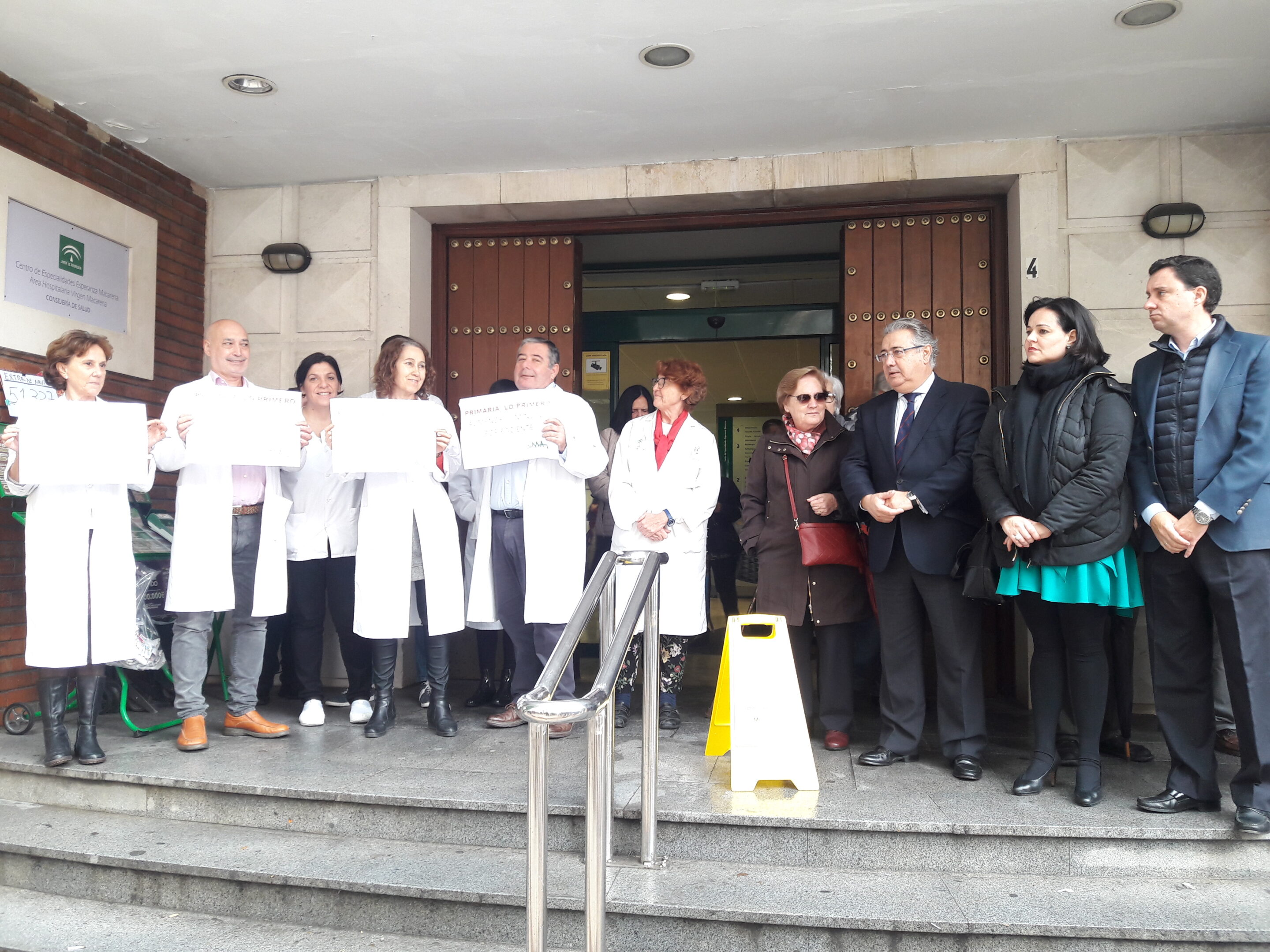 El cabeza de lista del PP de Sevilla, Juan Ignacio Zoido, y la presidenta del PP de Sevilla y candidata número 2 al Parlamento andaluz, Virginia Pérez, han participado en la concentración de diez minutos que todos los jueves lleva a cabo el personal sanitario en los centros de salud reclamando diez minutos de atención a cada paciente.
